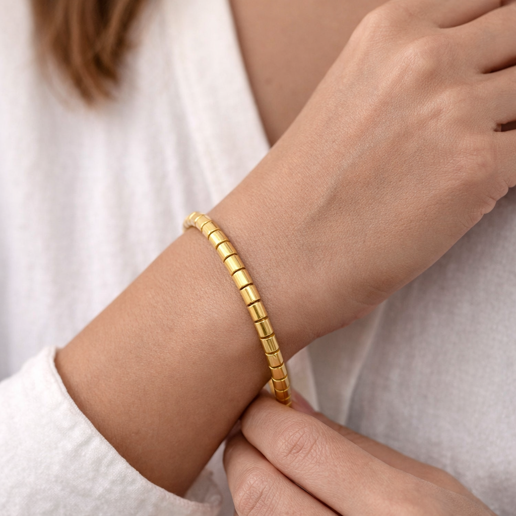 Clean lines meet bold presence in the Segmented Cuff by Kreshya. Designed with distinct linear segments that create a refined, architectural look, this cuff adds instant edge and sophistication to any ensemble.