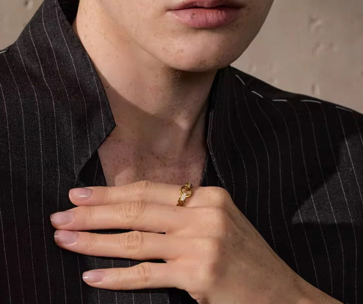 The Circle Cubic Ring blends timeless elegance with modern minimalism. Featuring a sleek circular band adorned with a precision-cut cubic stone at its center, this piece radiates understated brilliance. Its lightweight design ensures everyday comfort, while the cubic detail adds just the right amount of sparkle, perfect for both casual wear and elevated occasions.