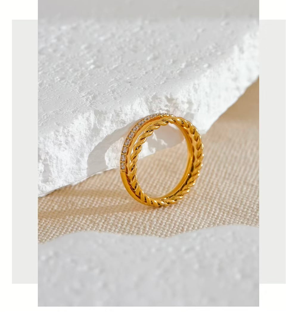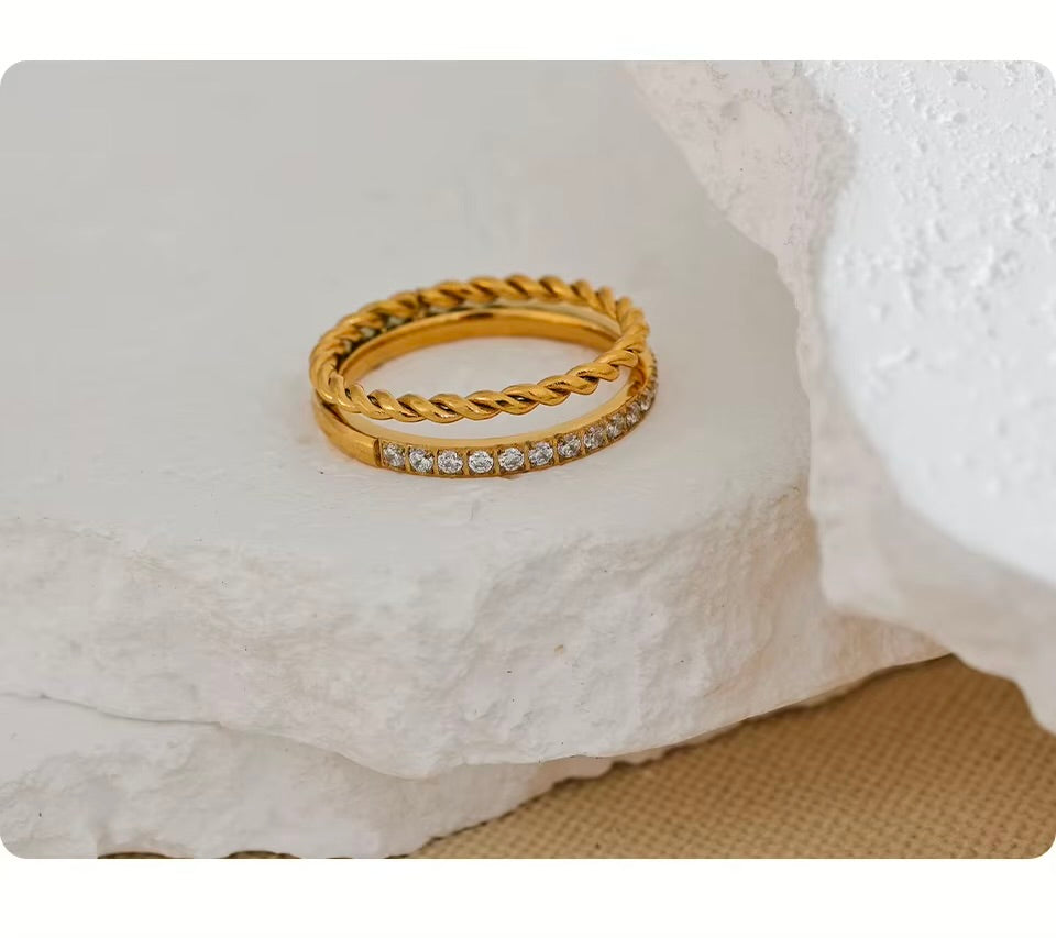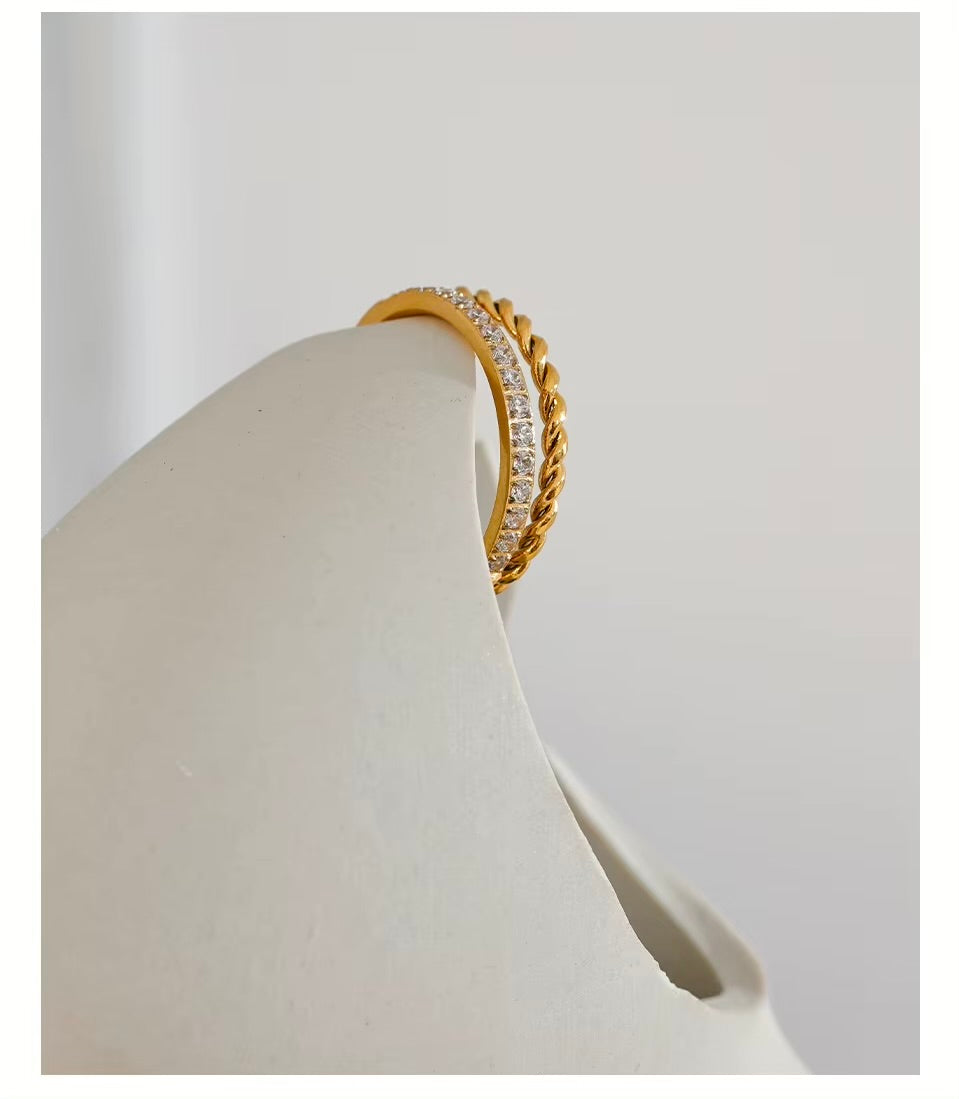 A harmonious blend of texture and sparkle, the Double Band Twisted Ring features two distinct yet complementary designs. One band is delicately twisted for a fluid, sculptural feel, while the other is meticulously set with shimmering stones that catch the light with every movement. The open design gives it a modern edge, making it perfect for stacking or wearing solo as a statement.