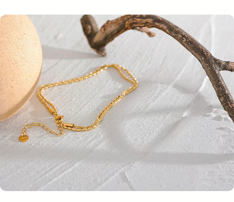 A touch of elegance with twice the charm , the Double Delight Anklet features dual layered chains, gracefully designed to drape around your ankle with effortless sophistication. Each layer complements the other, creating a refined, stacked look that catches the light with every step.