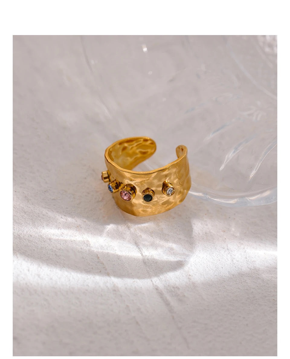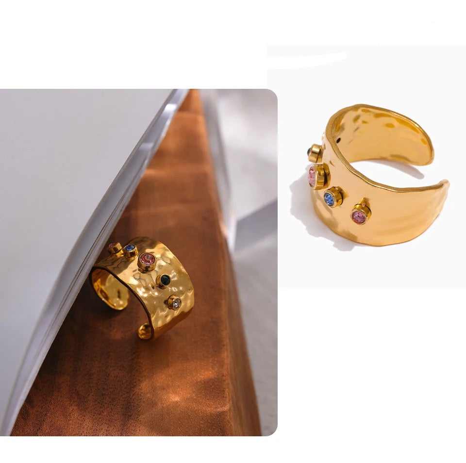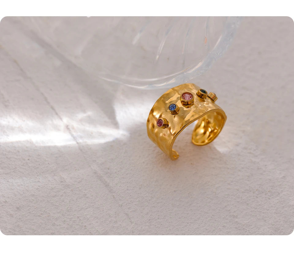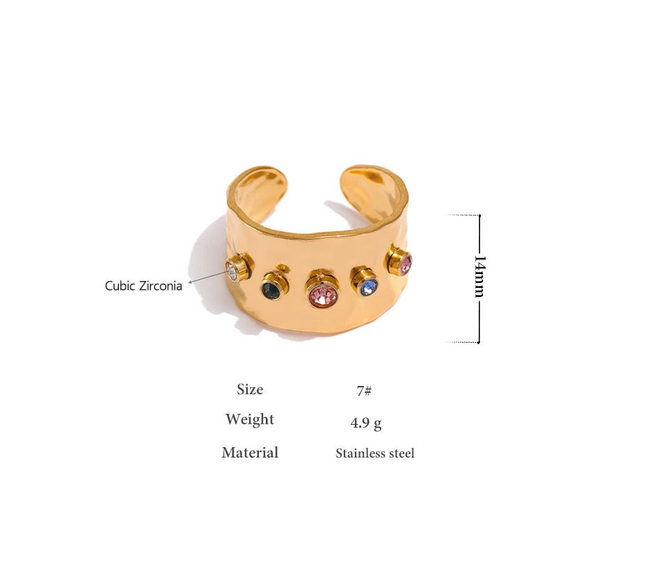 A gold-coated ring adorned with a multicolor rainbow gemstone sounds like a stunning and vibrant piece of jewelry that would catch the eye with its brilliance and colorfulness. The base of the ring is made from a durable stainless steel, coated with a layer of radiant gold. This emission free gold coating not only enhances the ring's appearance but also adds a luxurious touch.