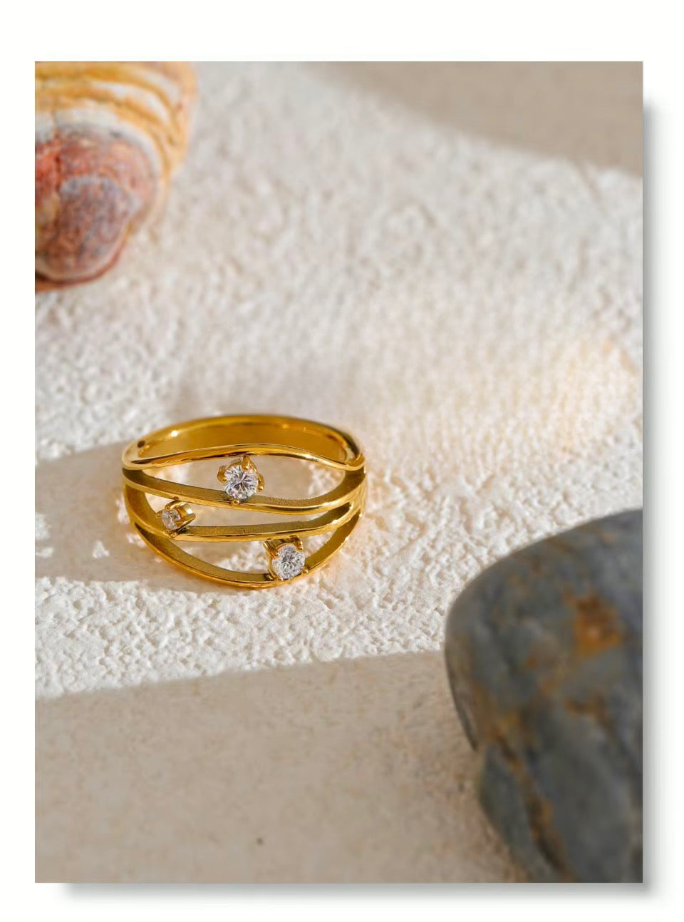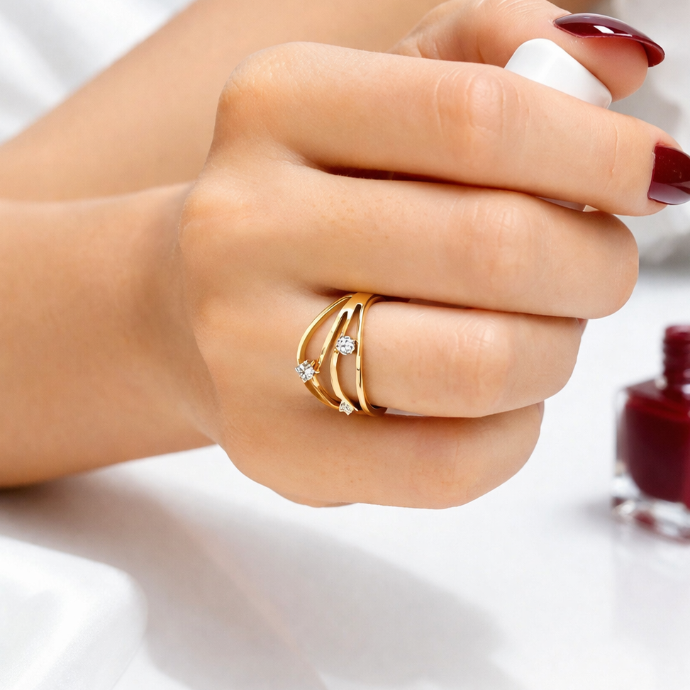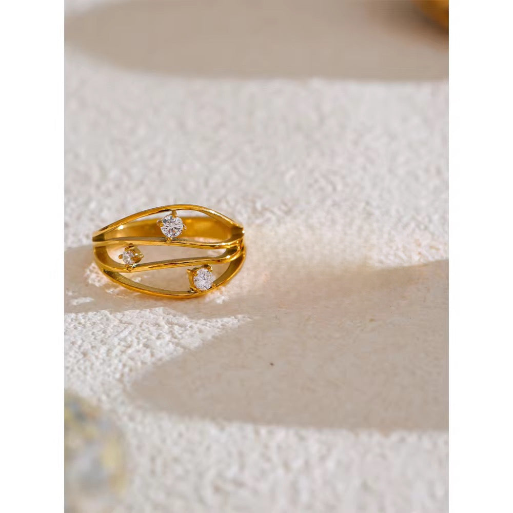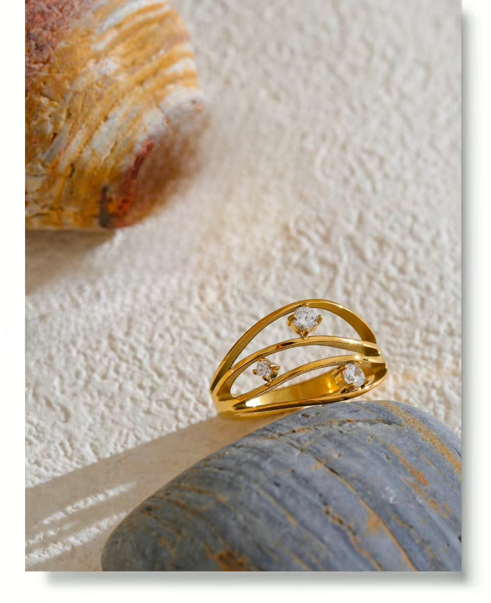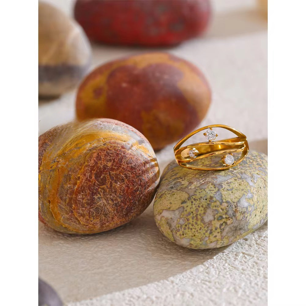 The Dune Royal Ring brings a wave of elegance to your everyday style. Designed with three gentle curves, each wave is topped with a sparkling stone — creating a layered look that feels both bold and graceful. Though it looks like a stack, it's actually one beautifully crafted ring that stands out effortlessly.