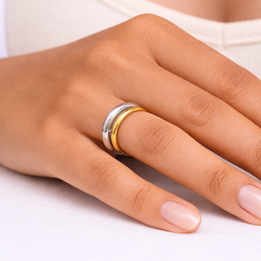 Designed for those who embrace contrast with elegance, the Parallel Harmony Ring brings together the warm richness of gold and the cool sophistication of silver in a seamless, dual-tone band. The two tones run side by side in a clean, uninterrupted flow — symbolizing unity, balance, and refined modernity. Its smooth, contoured structure ensures a comfortable fit, making it an effortless statement for everyday wear or elevated occasions.