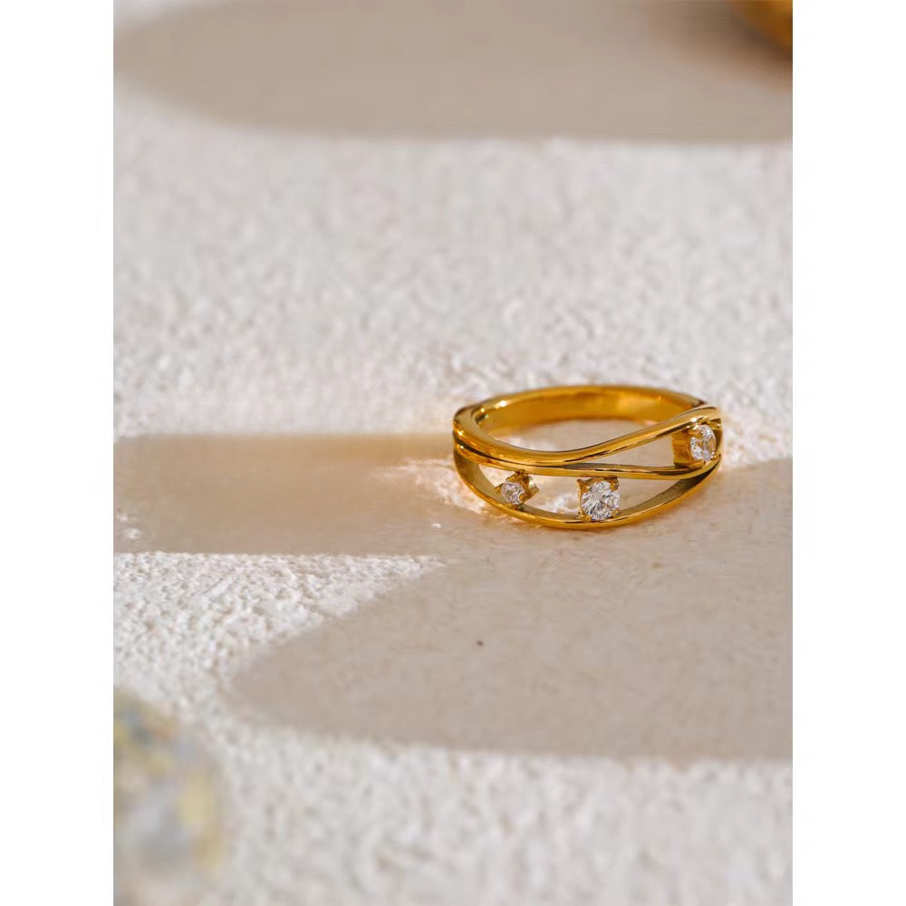 Refined and sculptural, the Trinity Wave Ring is a seamless fusion of two wave-like bands that flow in perfect harmony. One layer is adorned with two precisely set stones, while the other highlights a single, central stone, offering a composition that’s both balanced and visually striking. Crafted with hypoallergenic, sustainable materials, this ring is anti-tarnish and protected by Kreshya’s one-year warranty